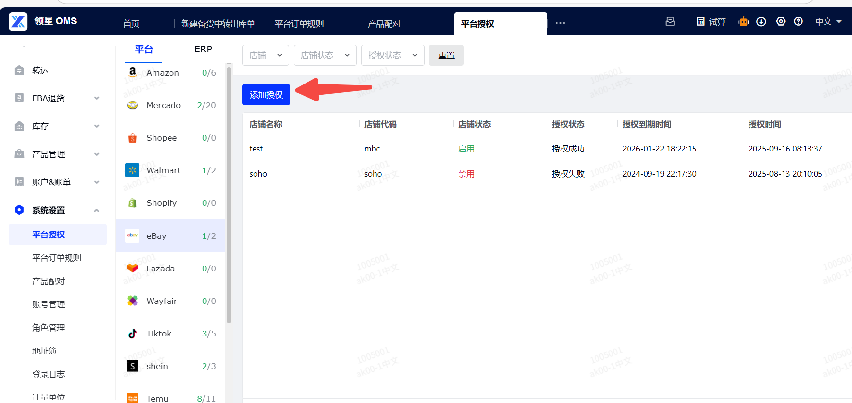 步骤:设置>平台授权>eBay>添加授权>填写基础信息(支持自定义)>前往授权