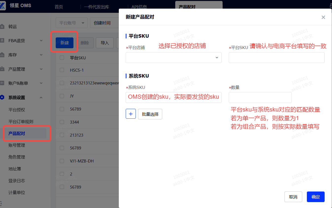 操作路径:OMS-系统设置-产品配对-新建,进行产品配对