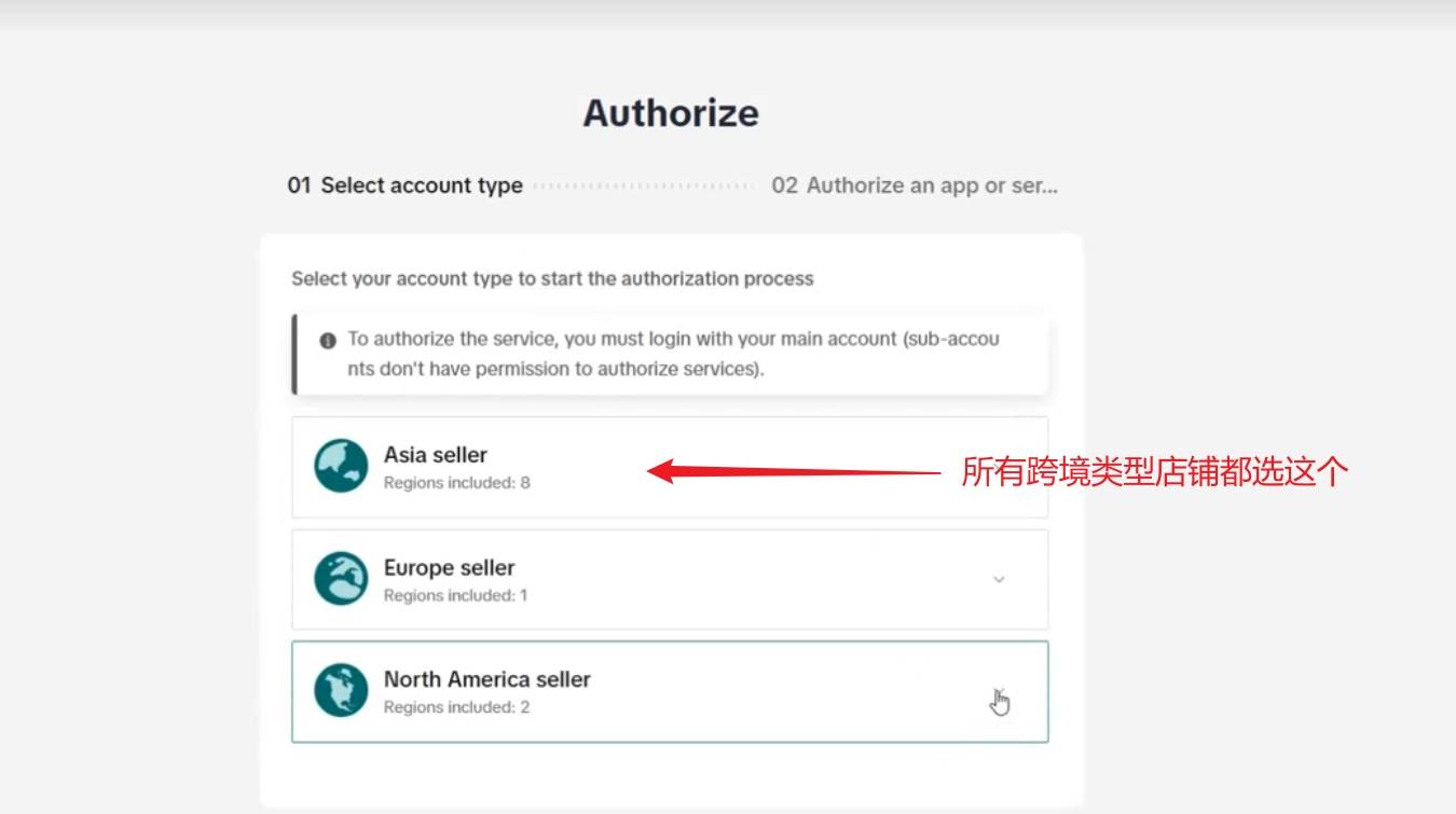● 【美国】跨境店铺,在OMS授权选择US-跨境店铺,跳转到TK授权界面选择Asia seller—Chinese mainland and the Hong Kong SAR (Cross-Border only)