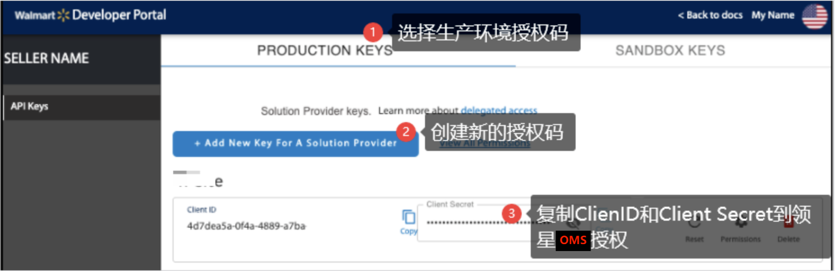 b.创建时Solution provider 选择LingXing ERP并创建New Key,复制Client ID和Client Secret到领星OMS页面授权