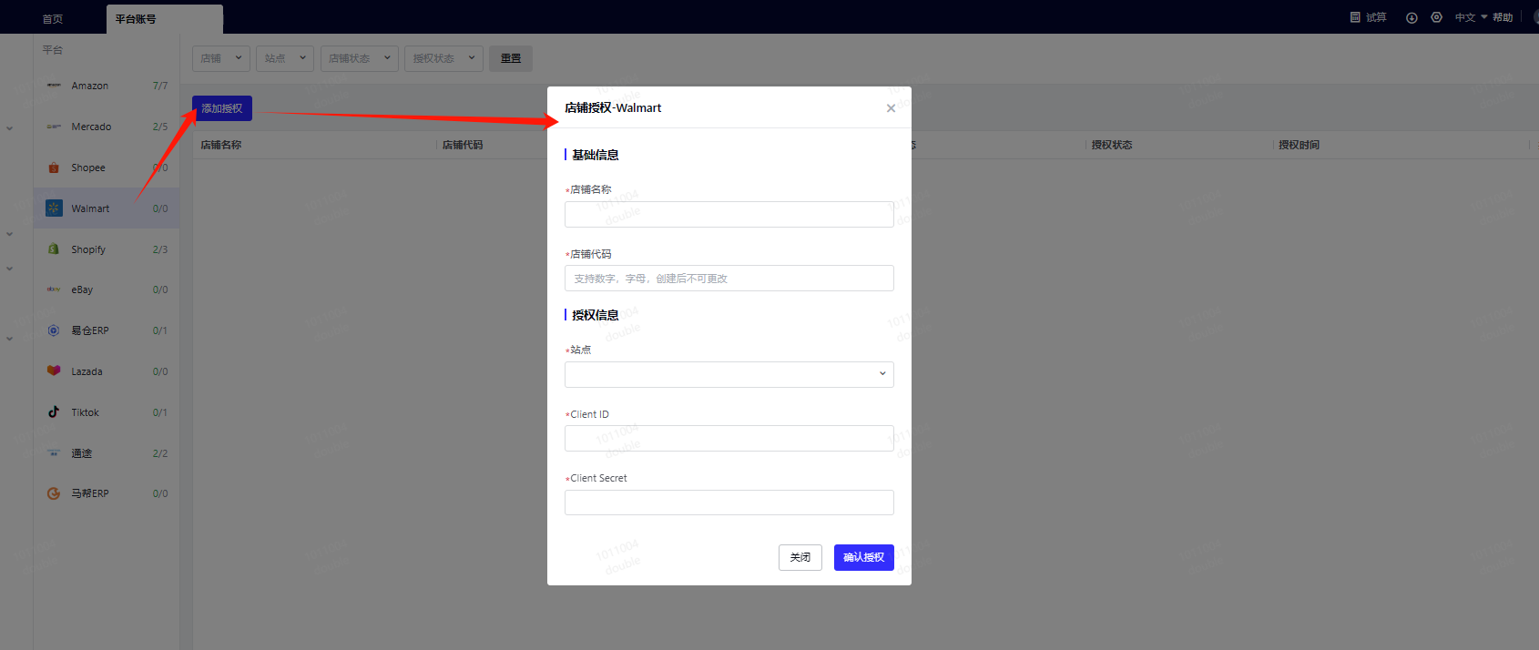 登录OMS系统,进入【系统设置-平台授权】页面,找到Walmart点击【添加授权】。