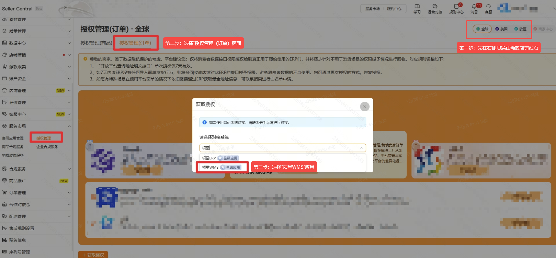 第三步:授权管理(订单) > 点击获取授权 > 选择领星WMS > 确认