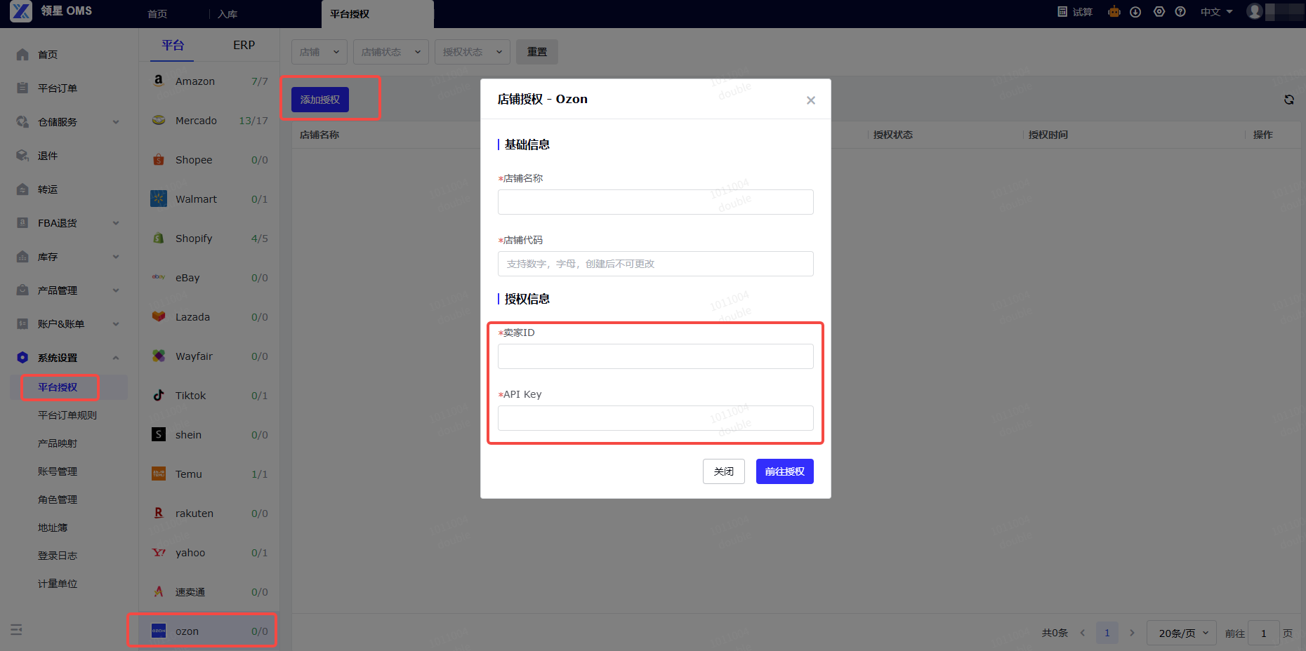 把上面复制【Client ID】填入领星OMS-OZON店铺授权页面的【卖家ID】字段中,【API Key】填入【API Key】字段中,点击【前往授权】。