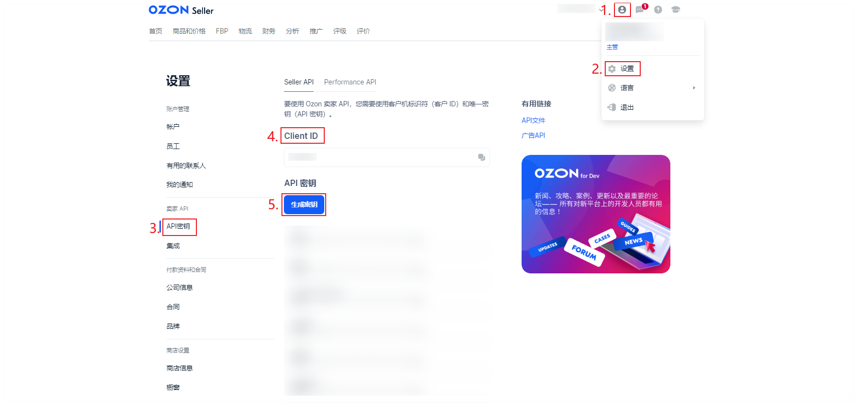 进入OZON店铺后台,在【右上角个人中心-设置-API密钥】页面中复制【Client ID】;