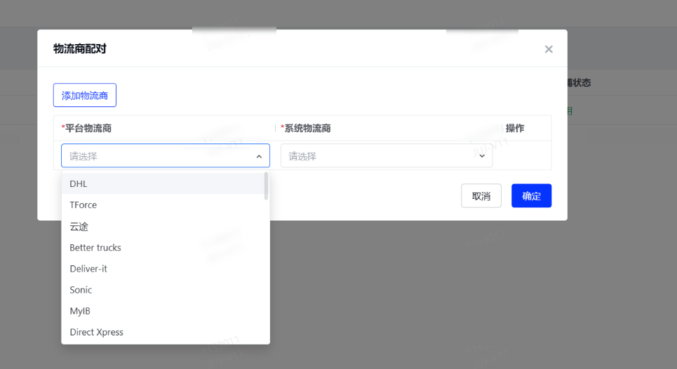物流商配对:将平台物流商与系统物流商进行配对,平台物流商为temu向客户开放的物流商,系统物流商为系统自带的物流商,例如:平台物流商【美国邮政】配对系统物流商【USPS】