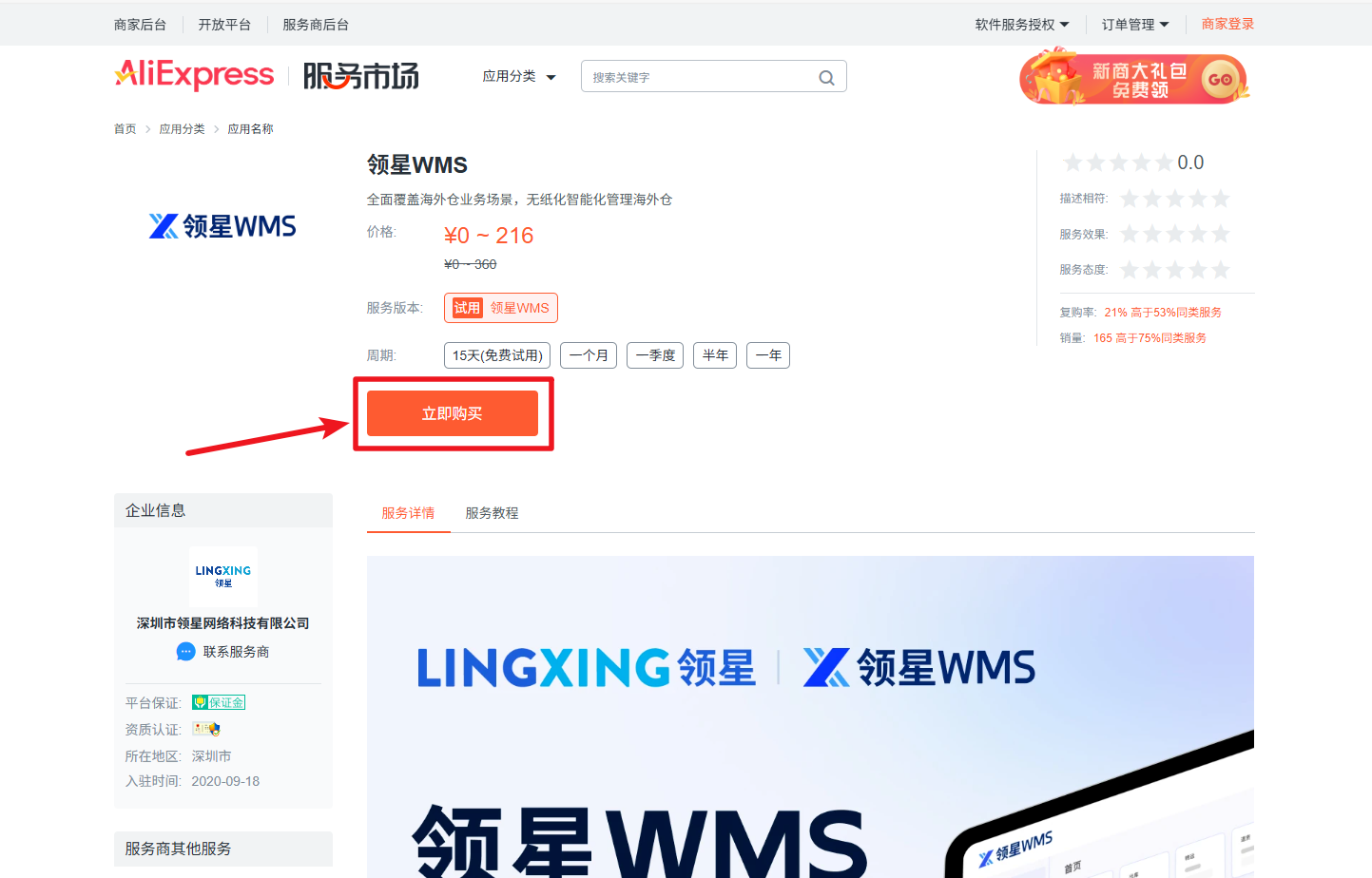 ● 进入链接并登录店铺账号(请注意,此处需登录海外托管店铺账户):服务详情 点击【立即购买】