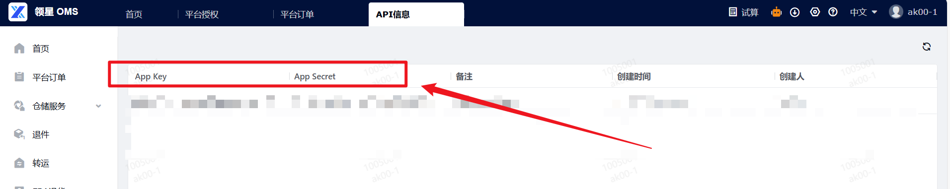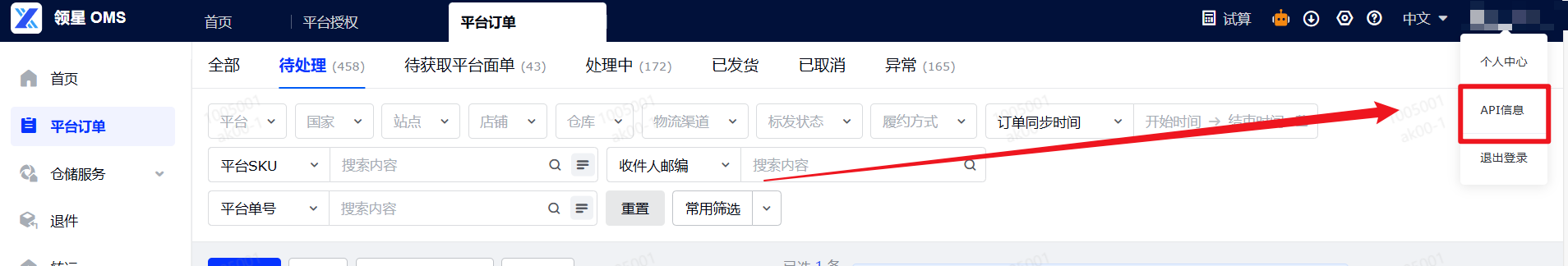登录OMS系统,点击OMS右上角的头像,点击API信息,获取App Key 和App Secret