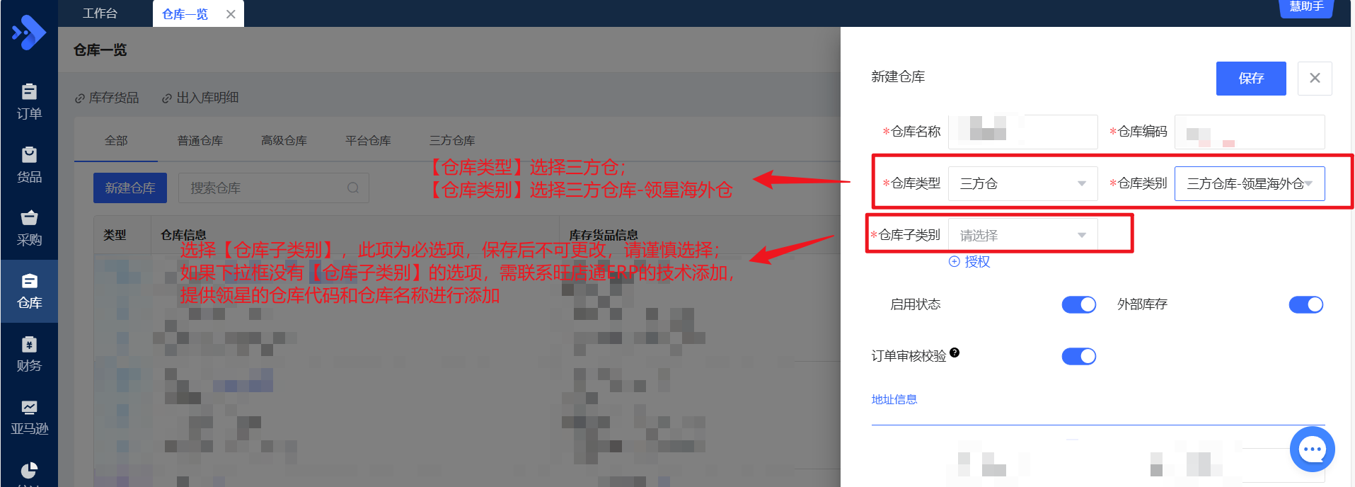 Q1:对接旺店通新建仓库,仓库子类别那里没有仓库代码怎么办