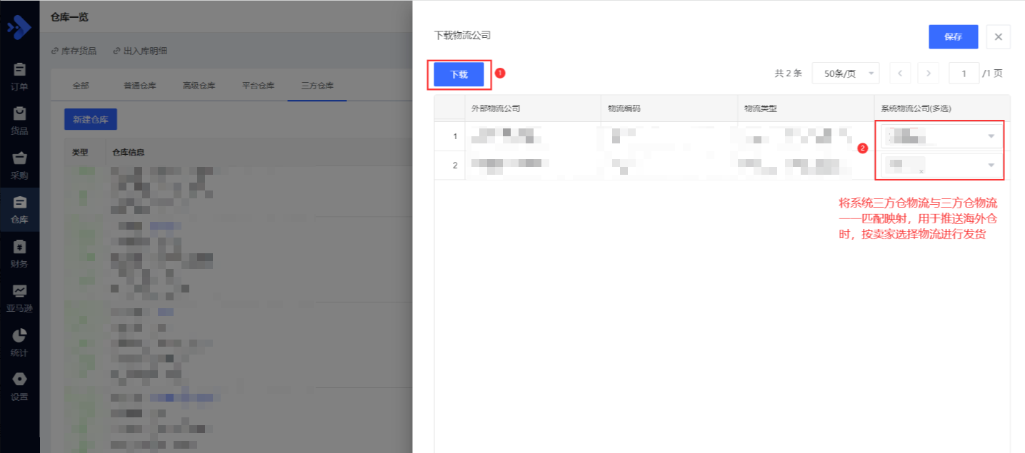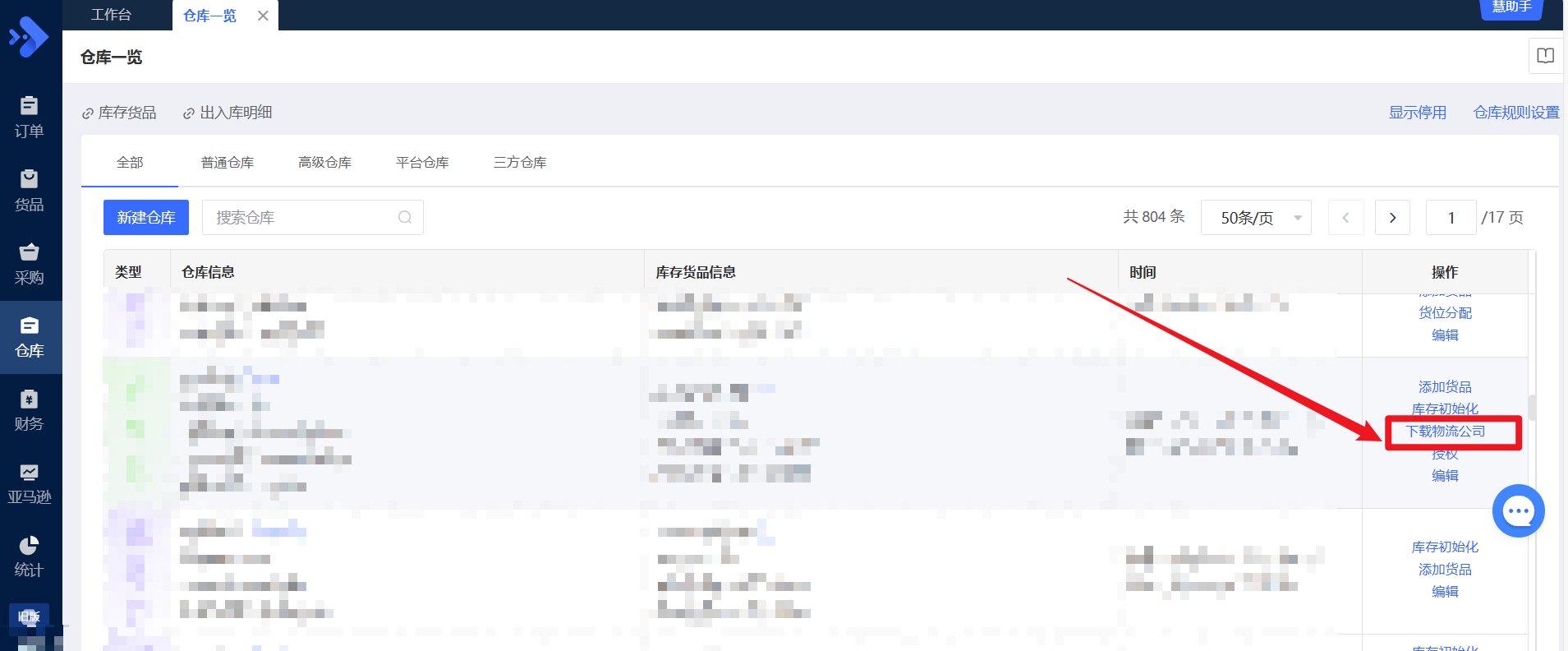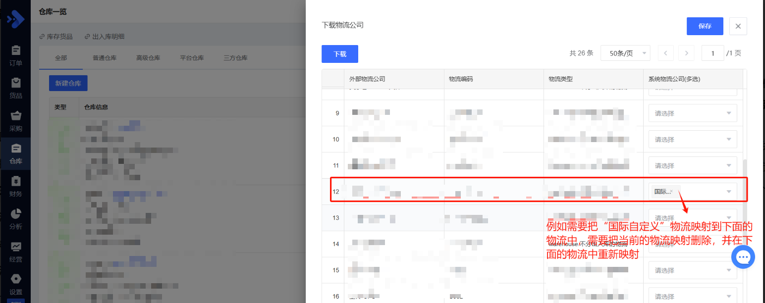 设置路径:仓库-库内管理-仓库一览-下载物流公司
