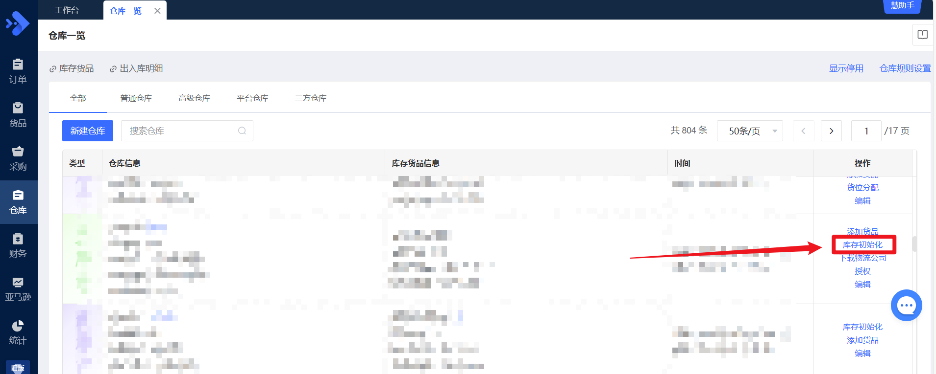 设置路径:仓库-库内管理-仓库一览-库存初始化