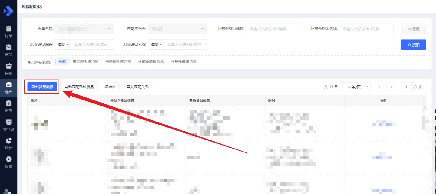 手动点击库存初始化后会同步三方仓货品信息至ERP系统中,然后再点击刷新货品数据查看即可。