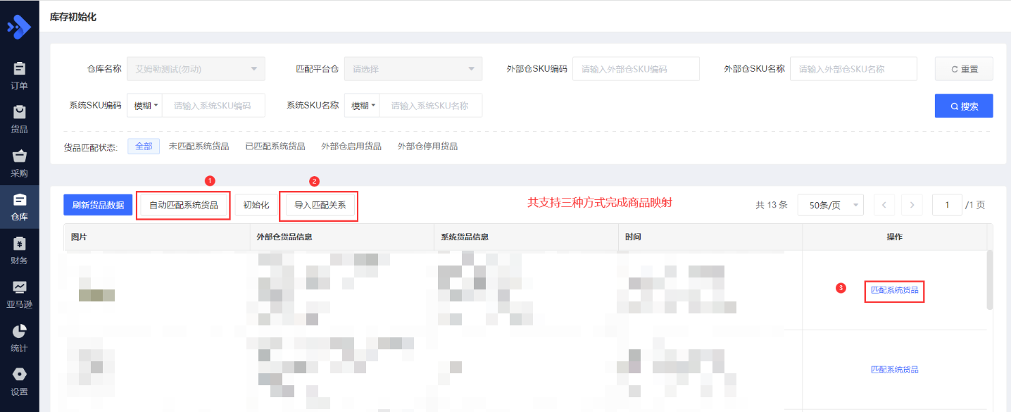 当ERP系统SKU与三方仓SKU一致时,可以点击自动匹配系统货品进行匹配;也支持通过表格导入匹配关系,或手动匹配货品完成映射。