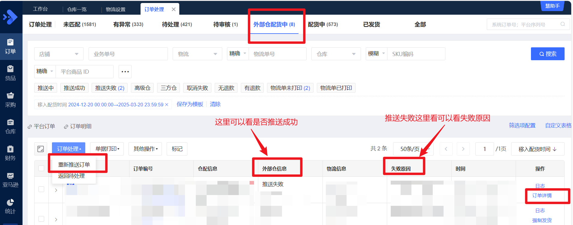 a.如果推送失败,可以查看具体失败原因,点击订单详情做相应修改,修改后再勾选此订单,然后点击重新推送订单。