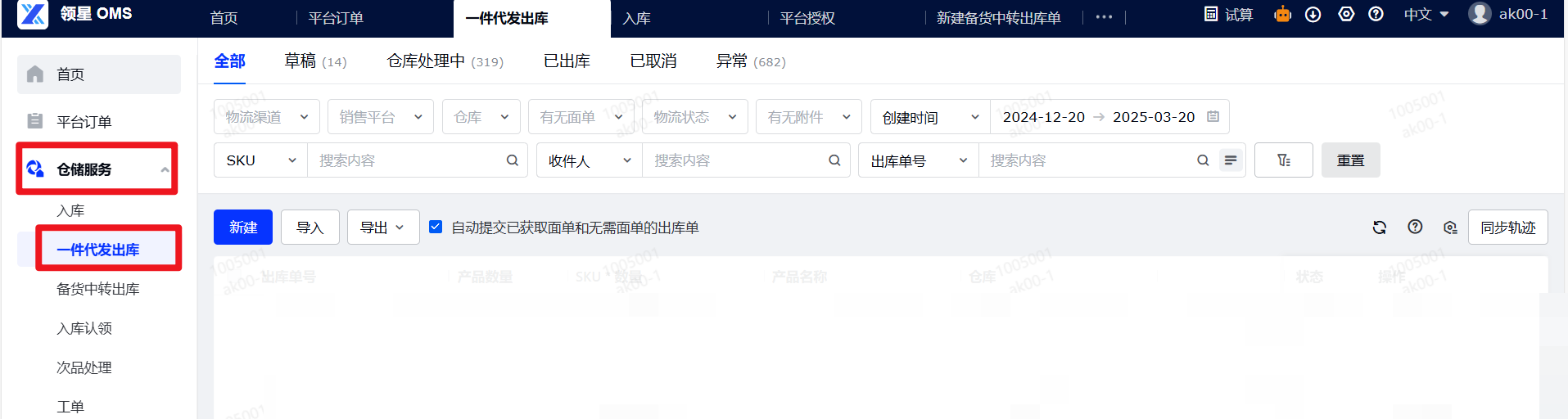 b.成功推送到领星OMS后,会在OMS-仓储服务-一件代发出库单中显示这些订单