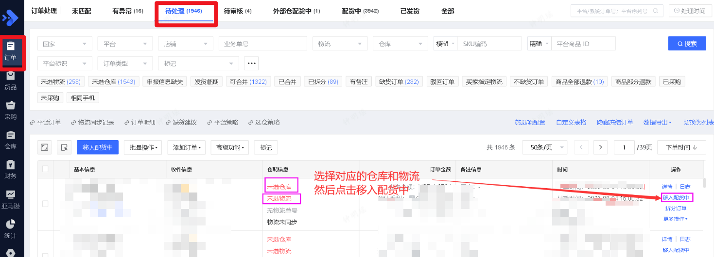 操作路径:订单-订单处理-待处理状态界面,给要发货的订单选择好对应仓库和物流,点击移入配货中