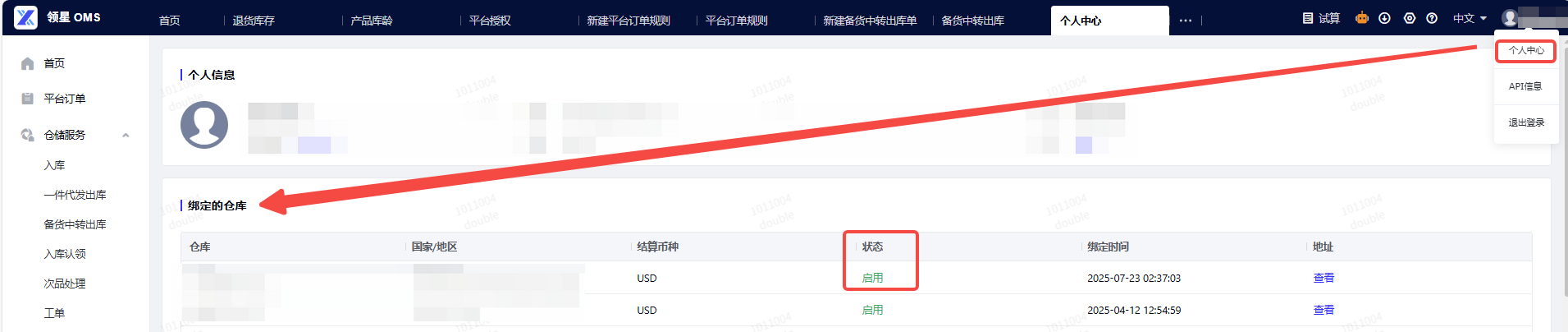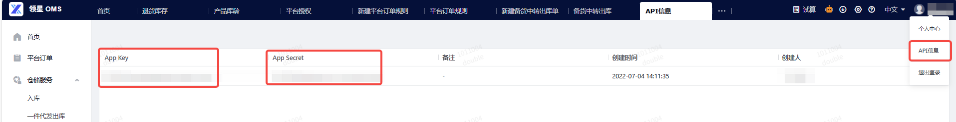 (2)路径:领星OMS - 点击右上角头像 - API信息