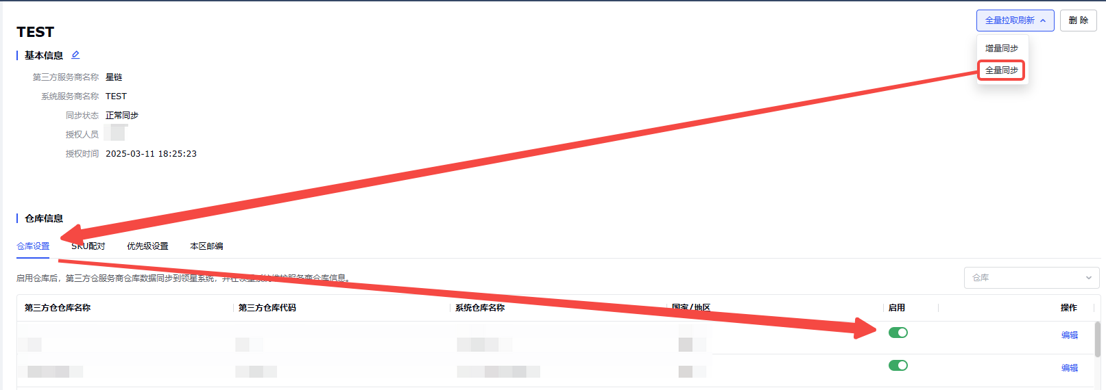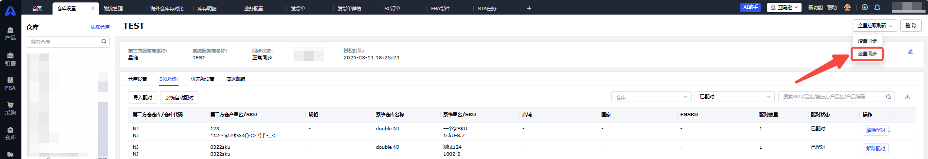 首次完成领星ERP授权后,可以点击领星ERP - 仓库设置 - 全量拉取刷新 - 全量同步,同步已授权OMS账号的库存量。(如果您已完成2.3.5导入库存初始值的操作,可忽略这一步)
