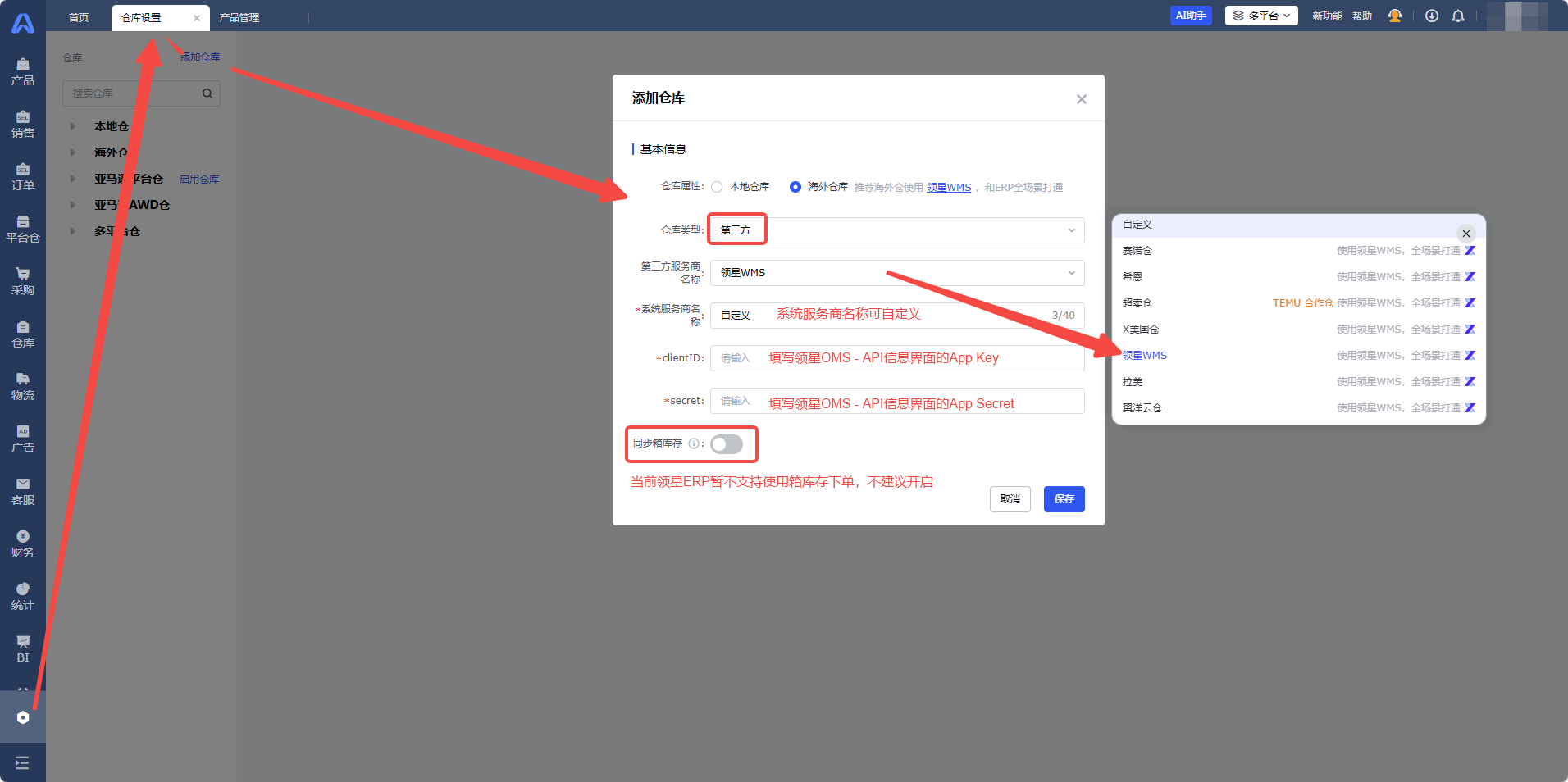 答案:请确认①第三方服务商选择的是领星WMS海外仓;②您填写的ClientID与secret来自于领星OMS账号的API信息,领星WMS管理后台的API信息仅用于智能设备对接,无法完成ERP授权。