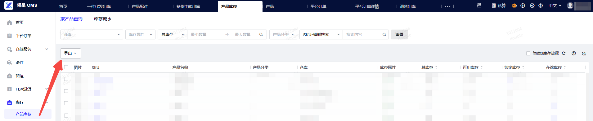 第二步:在领星OMS - 库存 - 产品库存界面,导出库存数据用于填写表格。