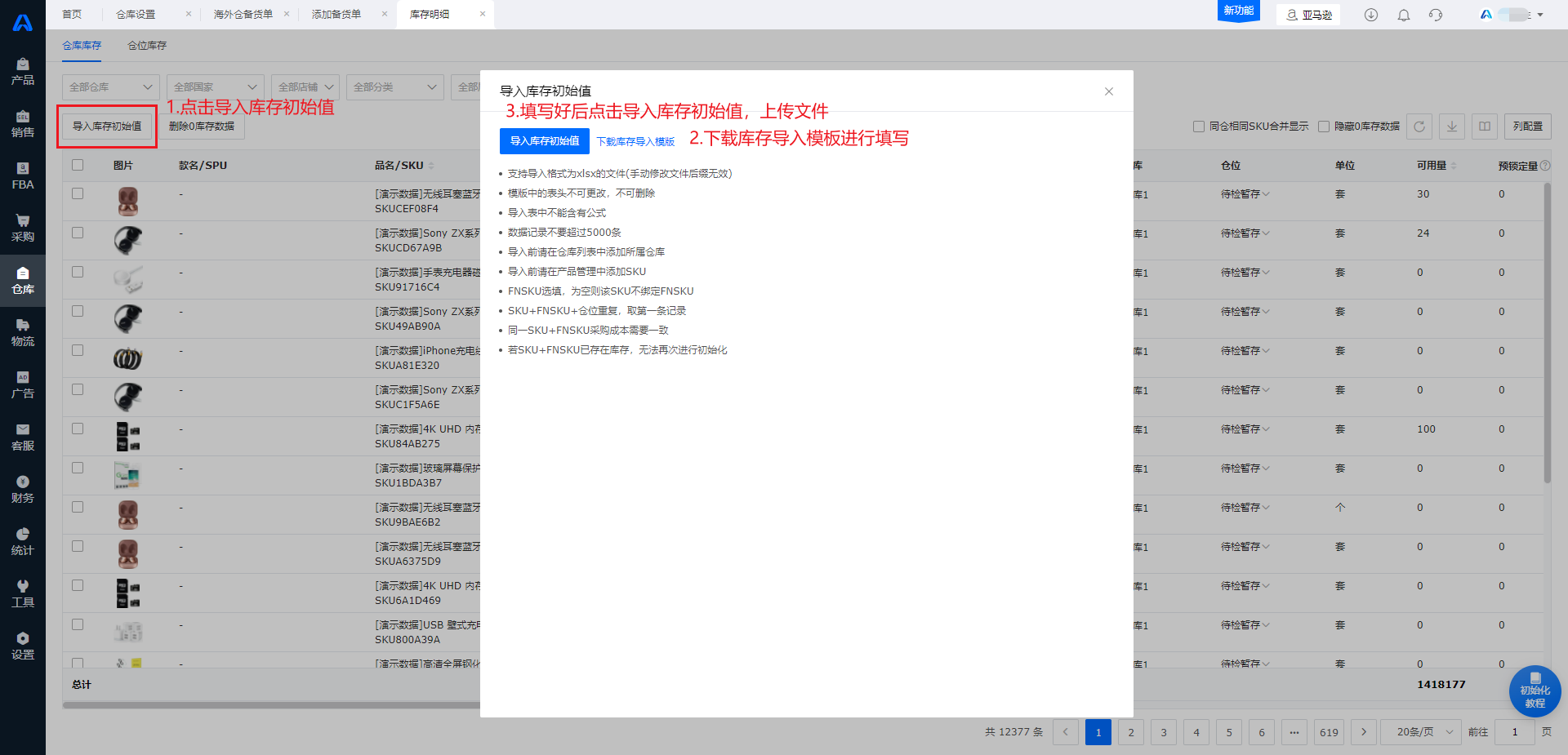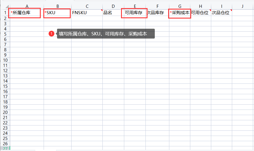 下载导入模板后,将初始库存和相应SKU填写好导入维护初始库存。