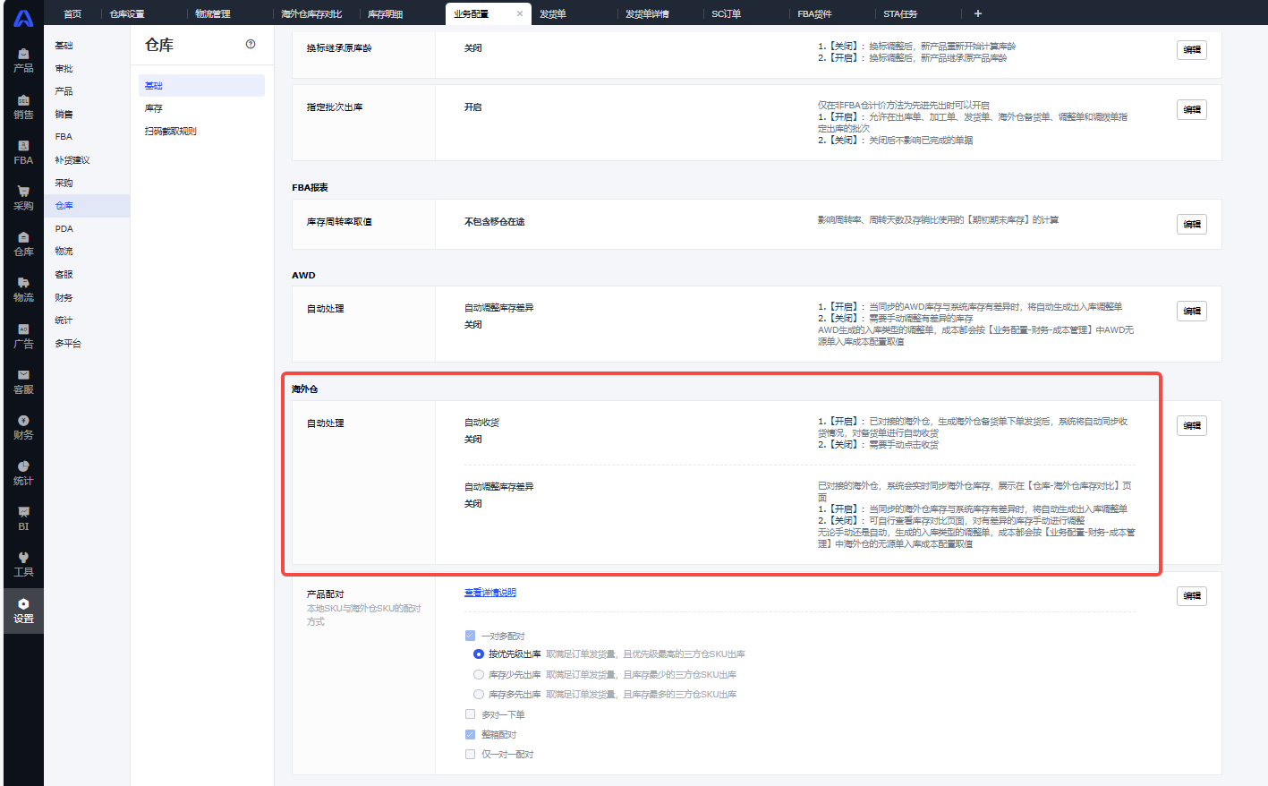路径:领星ERP - 设置 - 业务设置 - 仓库 - 基础 - 海外仓 - 自动处理