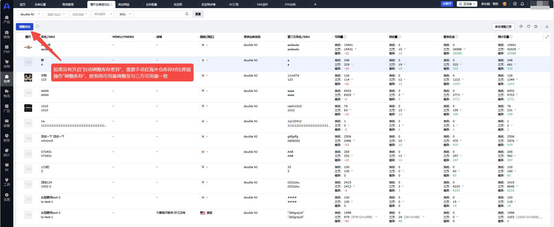 开启后,当海外仓库存对比界面的【系统可用量+锁定量】与【三方仓的可用量+锁定量】有差异时,【系统可用量】将按【三方仓的可用量+锁定量】自动同步调整。
