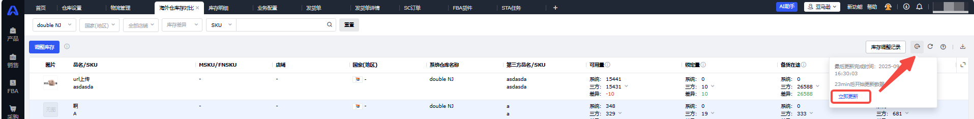 领星ERP每30分钟自动同步一次海外仓的库存量。如果您需要立即同步最新的库存量,可以在领星ERP - 海外仓库存对比界面,点击立即更新。