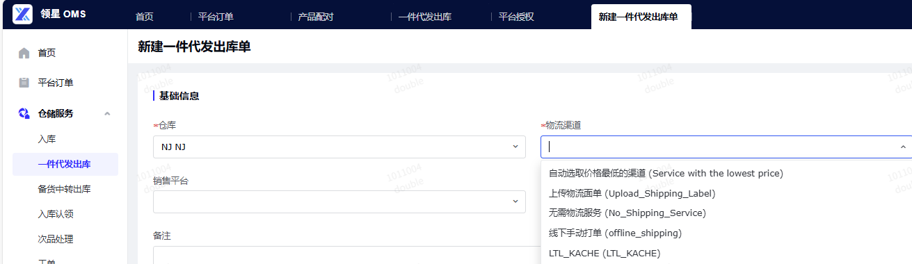 答案:领星ERP按领星OMS可使用的物流渠道列表进行同步,可以先确认领星OMS在创建一件代发出库单选择相同仓库时,能否使用到当前渠道。