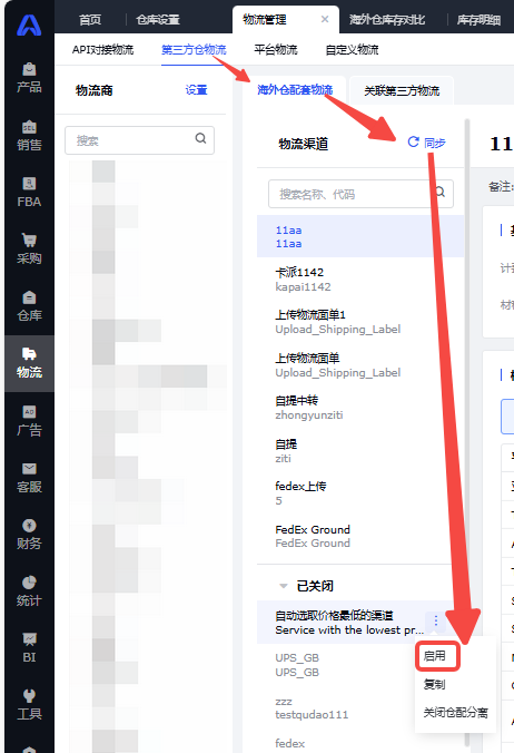 如果是仓库新配置的渠道,可以在领星ERP - 物流设置 - 第三方仓物流 - 海外仓配套物流 ,先点击同步,再从下方的已关闭列表中,操作“启用”。