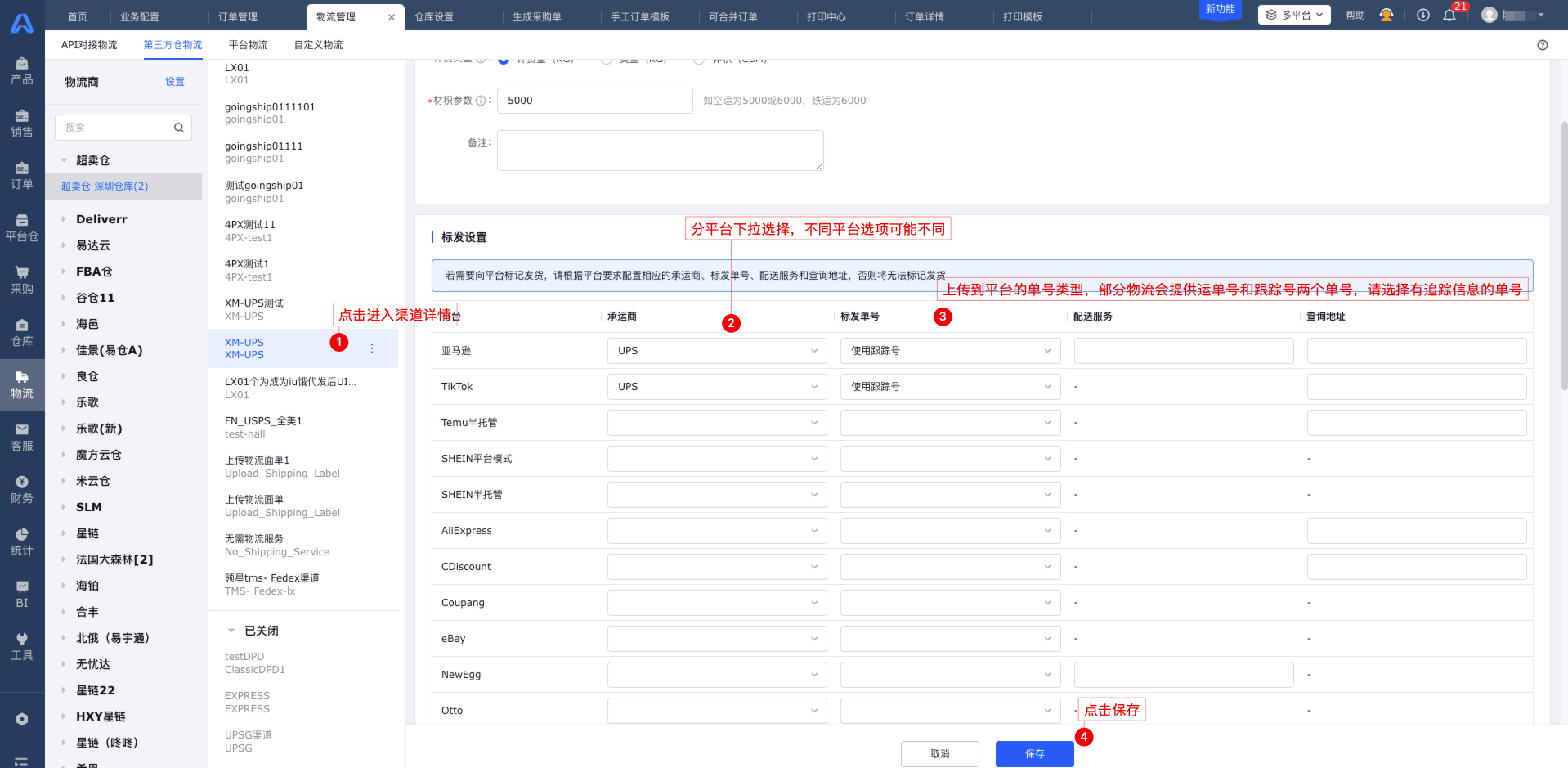 以下图为例:按页面显示设置,当订单使用了物流渠道XM-UPS发货时,该订单如果是亚马逊订单,在上传物流单号给平台时,将按 承运商=UPS,取 订单获取到的跟踪号 上传给平台。
