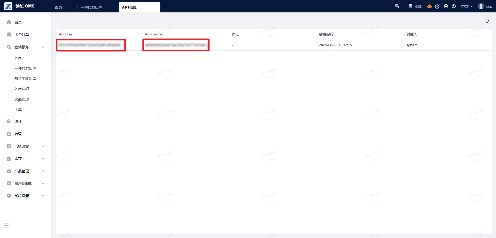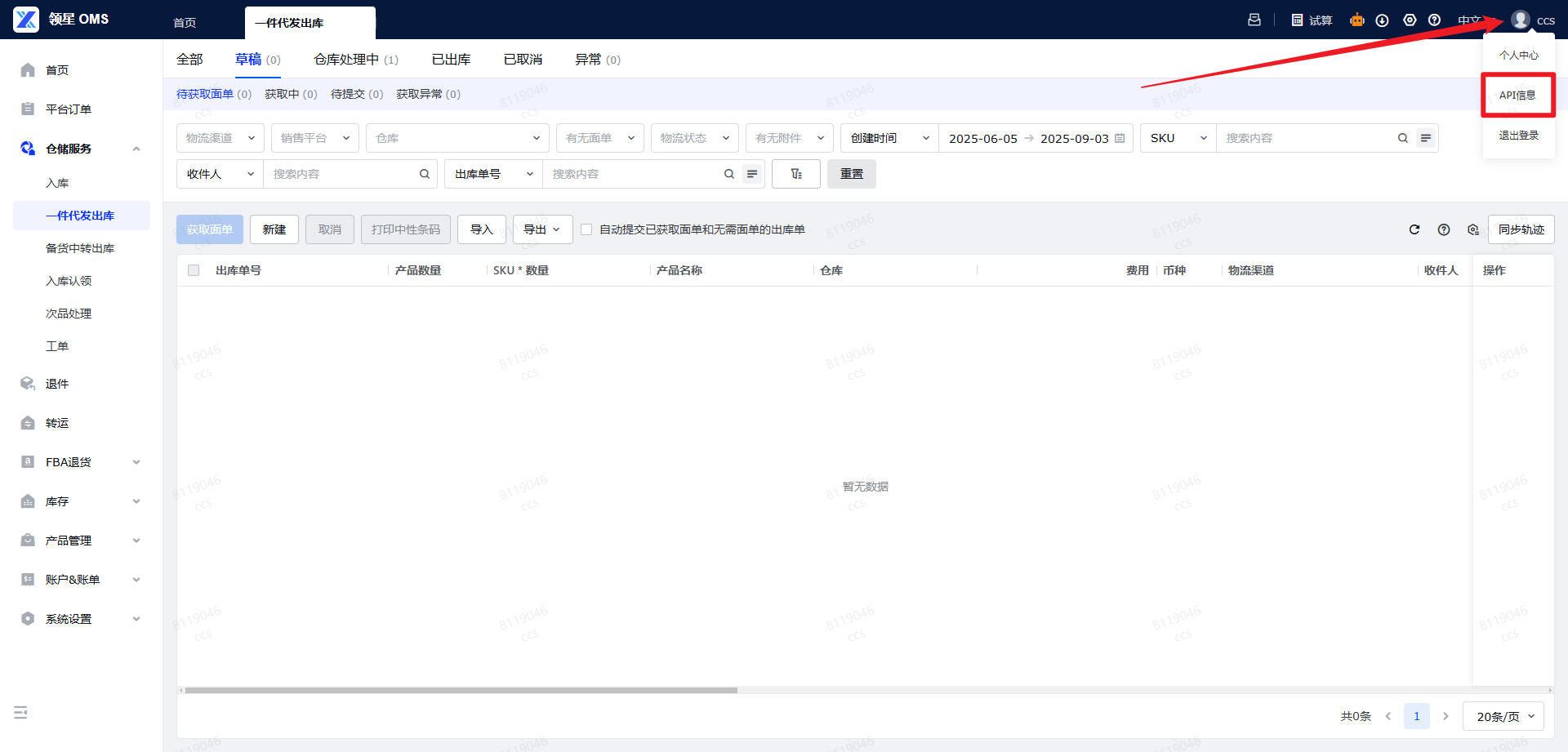 (1)进入OMS系统: 登录您的OMS账号,点击右上角头像-API信息