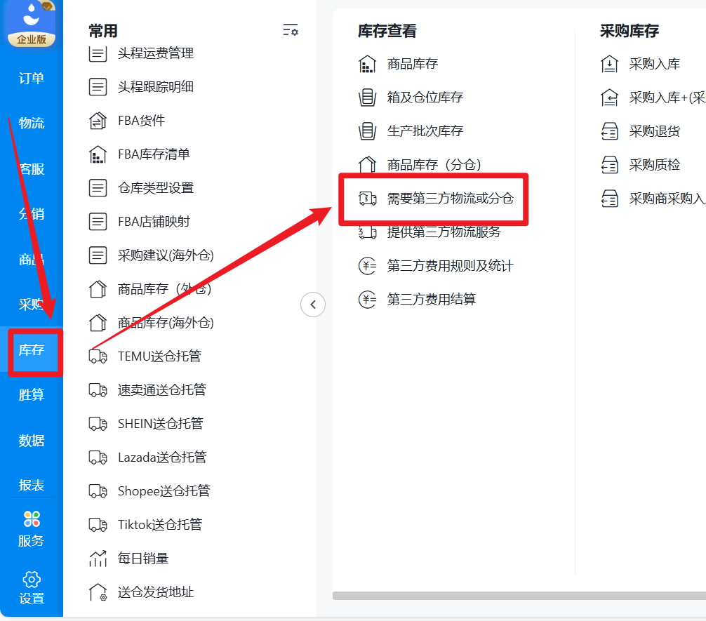 (3)进入聚水潭ERP:点击【库存】-【需要第三方物流或分仓】