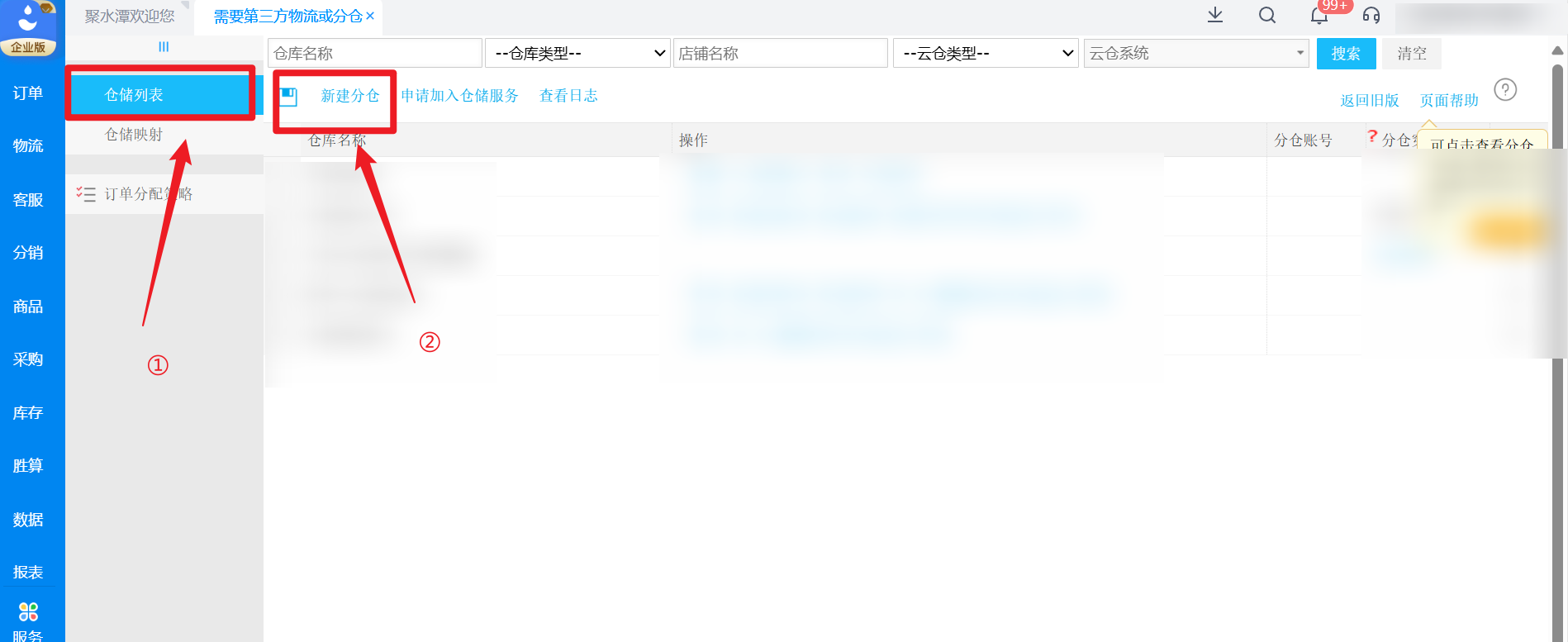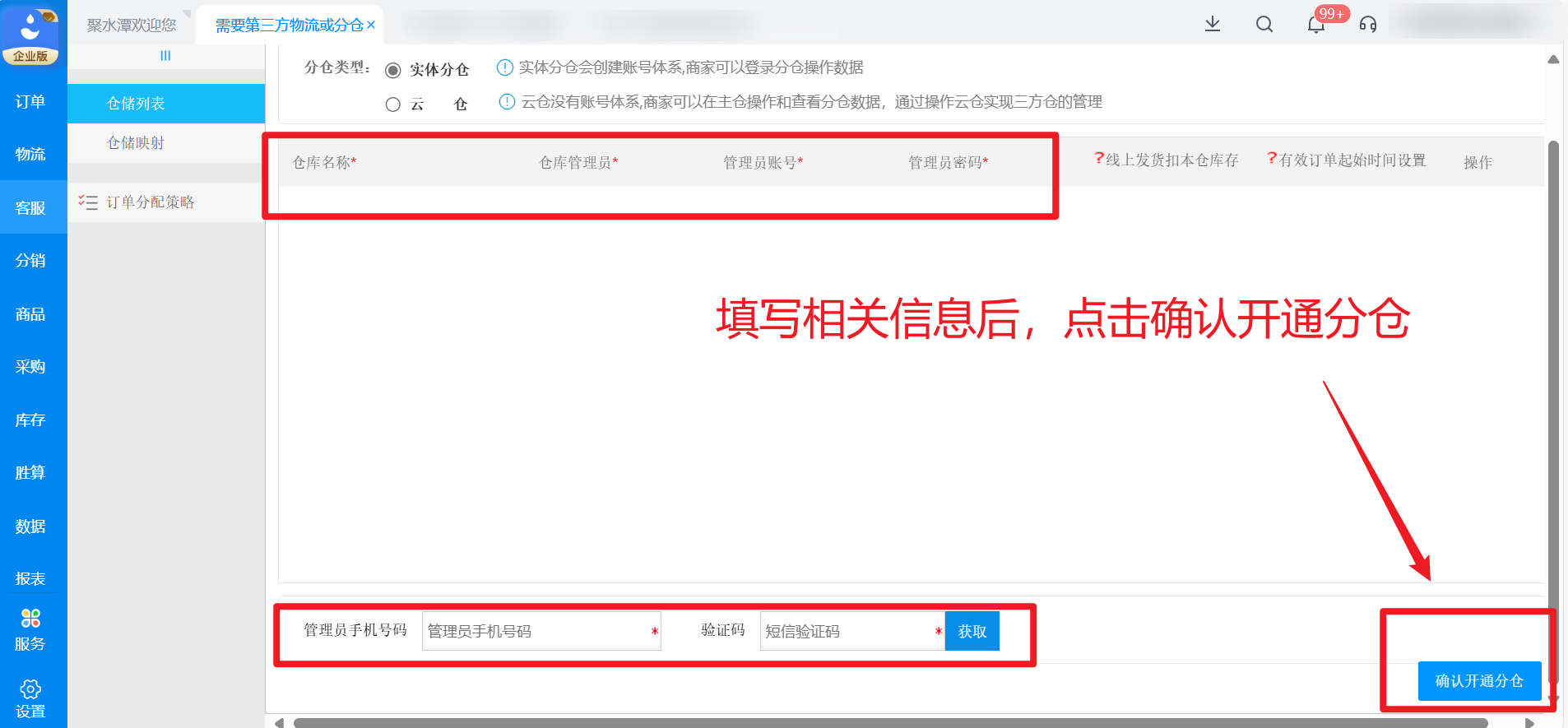 (4)进入聚水潭ERP:进入页面后点击【仓储列表】-【新建分仓】,可选择新建【实体分仓】或【云仓】,按需选择,选择后填写相关信息,点击【确认开通分仓】