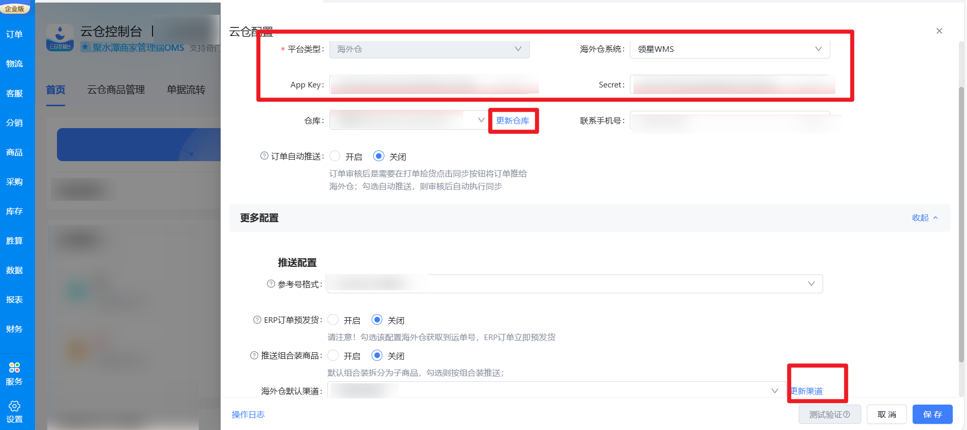 - 进入页面后选择仓库进行云仓配置,【平台类型】选择海外仓,【海外仓系统】选择领星WMS,将第一步在领星获取到API信息对应填写到 [APP KEY] 和 [SECRET] 中,然后点击更新仓库和下方的更新渠道,信息填写正确会出现对应的海外仓仓库和该海外仓渠道,选择要使用的仓库和渠道进行配对