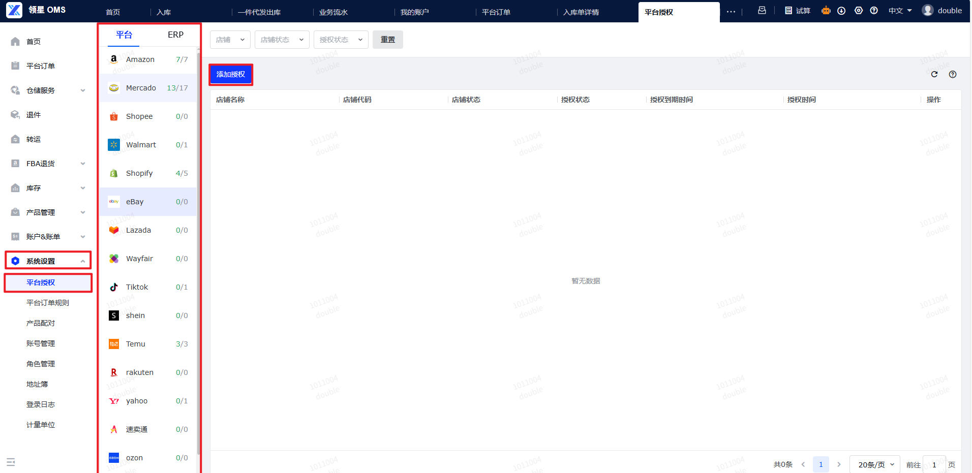 (1) 在领星系统授权电商平台店铺: 登录您的OMS管理后台,导航至系统设置菜单,点击平台授权,选择您使用的电商平台后添加授权,填写授权信息使用OMS平台订单实现发货 | 领星WMS帮助中心-卖家版