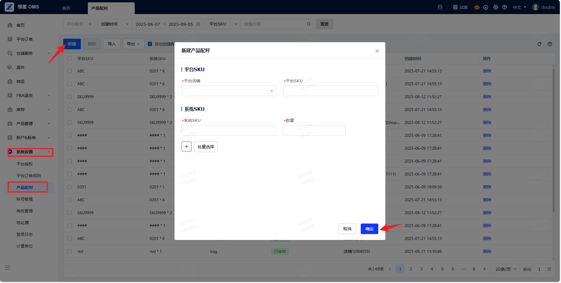 (3)产品配对:导航至系统设置菜单,选择产品配对,点击新建,填写产品映射信息后点击确认 使用OMS实现产品配对 | 领星WMS帮助中心-卖家版