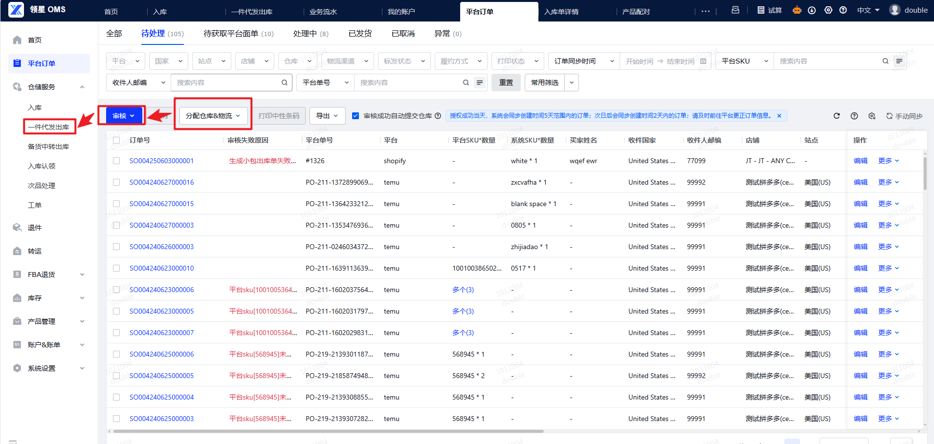 (5)在领星系统推送订单到海外仓:您可以将需要海外仓处理的订单,通过手动推送或自动推送的方式推送到海外仓:手动推送:手动分配仓库和物流,点击审核,审核成功后进入一件代发出库生成出库单到仓库,审核失败继续留在平台订单中