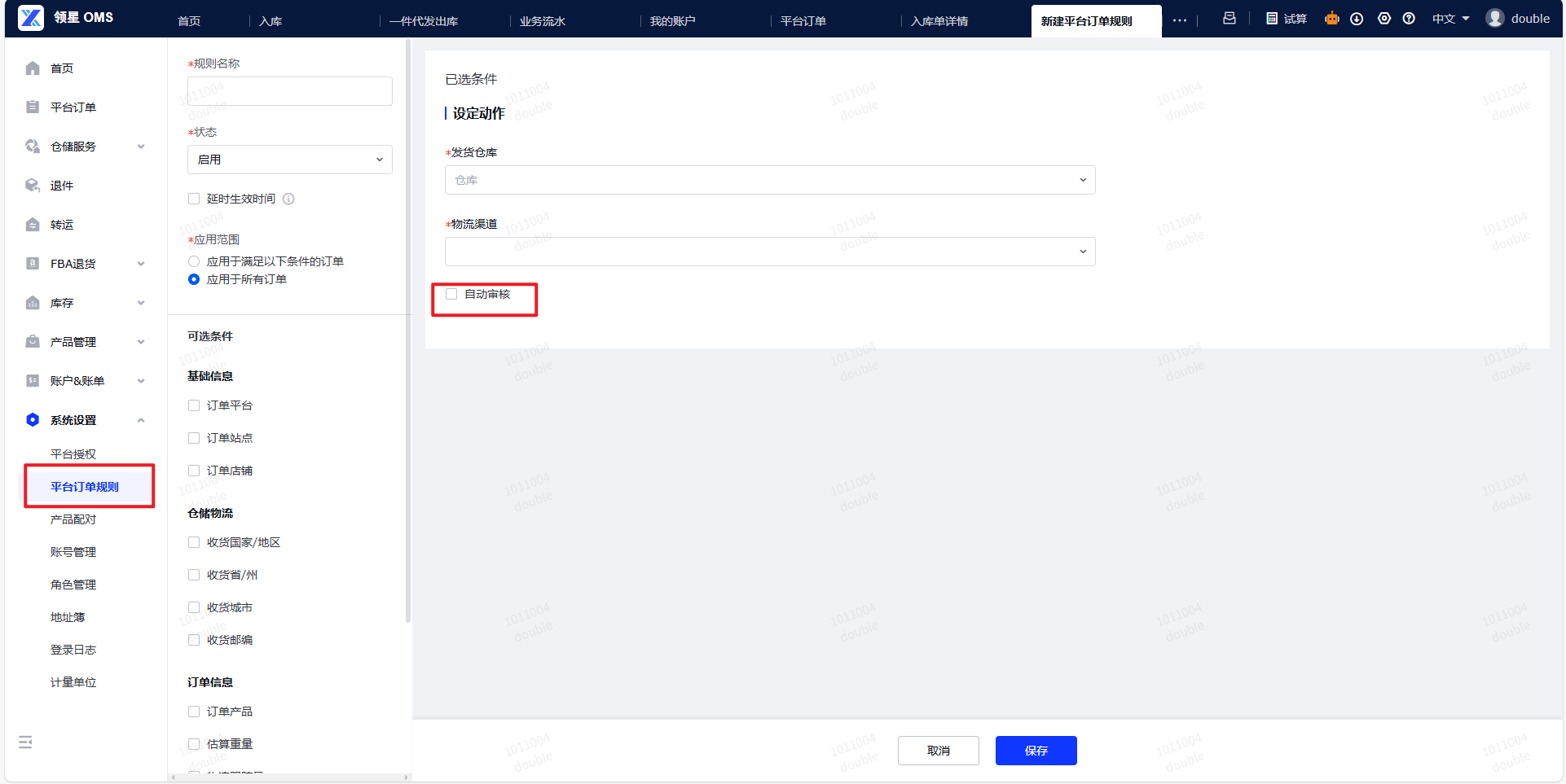 自动推送(支持按照邮编自动分仓):导航至平台订单规则菜单,点击创建规则,设置完订单规则后勾选自动审核使用OMS平台订单实现发货 | 领星WMS帮助中心-卖家版