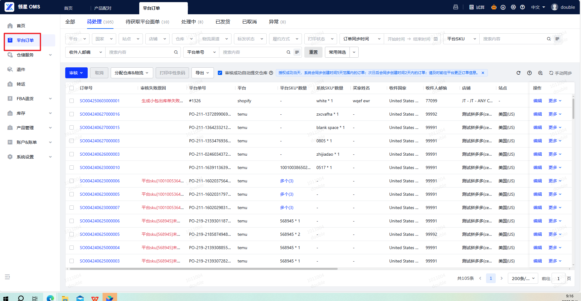 Q1:如果订单的发货数量超过领星仓库的库存数量,是否会部分发货,剩下的部分又没有明确的提示?答案:系统审核平台订单时会校验库存数量,若库存不足会审核不通过,此时可以在【平台订单-待处理-审核失败原因】中查看失败原因,并且不会向仓库推送出库单。