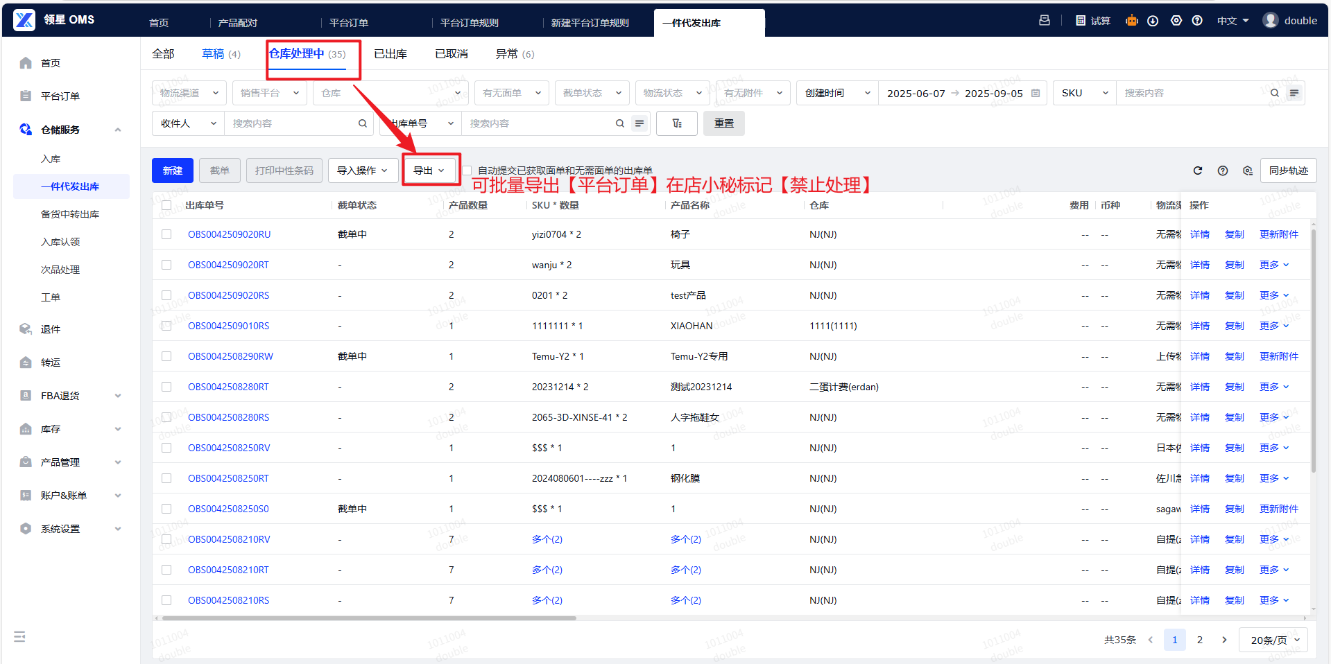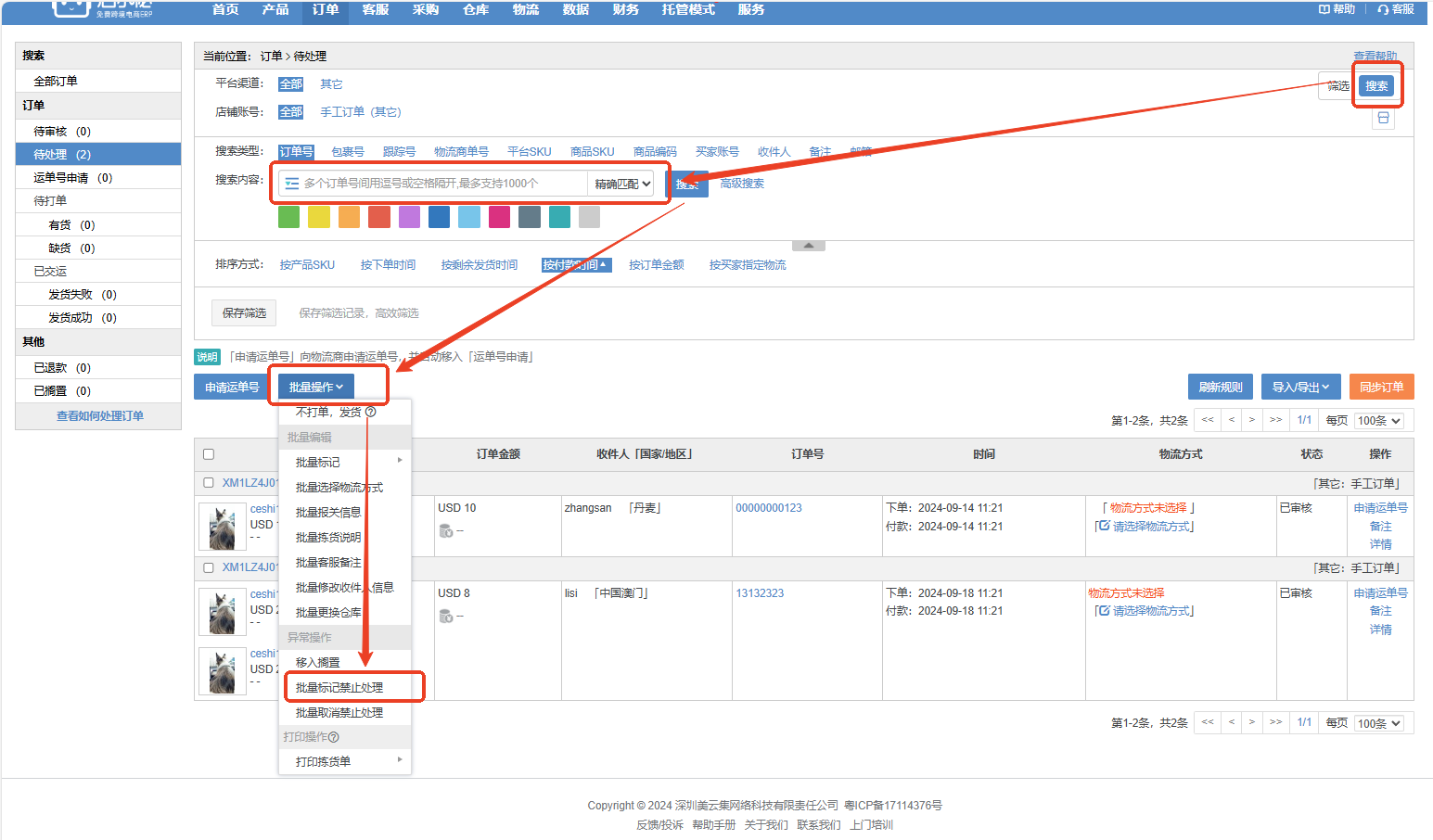 (6)卖家在店小秘中标记由领星履约的订单:适用场景:因不同仓库的地理位置、价格等因素不同,卖家经常会多仓备货,有的仓库不使用领星系统,所以全部订单中可能只有部分在领星系统履约;为避免重复发货,需要在领星把订单推到仓库后,在店小秘中进行标记。操作方法:可将仓库处理中状态下的订单平台单号批量复制至店小秘ERP系统,并批量标记禁止处理,即意味着这些订单在领星系统中履约,其余的订单可以继续在店小秘履约。