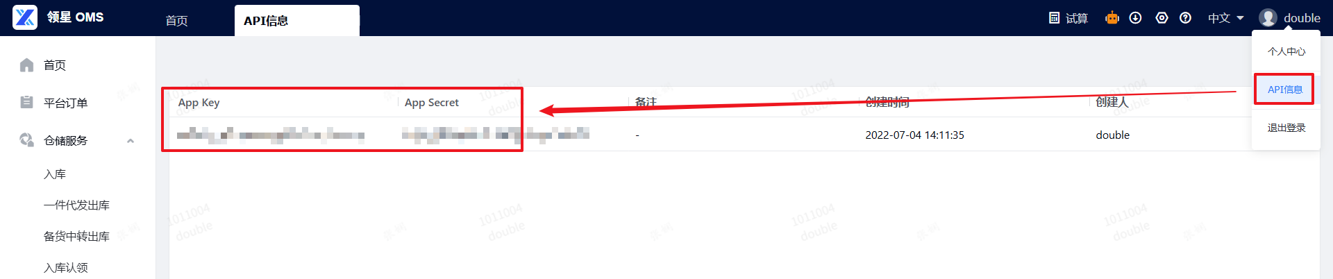(2)点击右上角头像“API信息”,获取App Key和App Secret信息