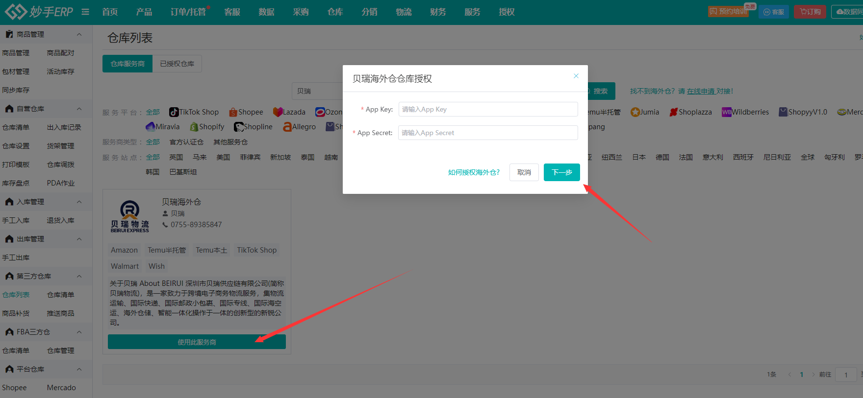 (2)仓库列表中搜索【贝瑞海外仓】,点击【使用此服务商】,输入从领星OMS复制的App Key和App Secret,分别填入输入框中,点击【下一步】,即可开始授权
