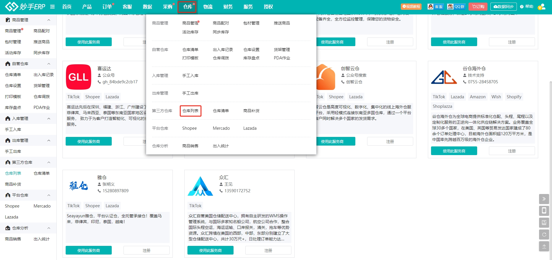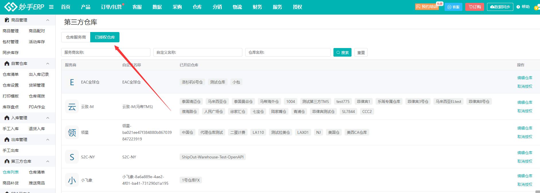 (1)打开妙手ERP-点击仓库-第三方仓库-仓库列表