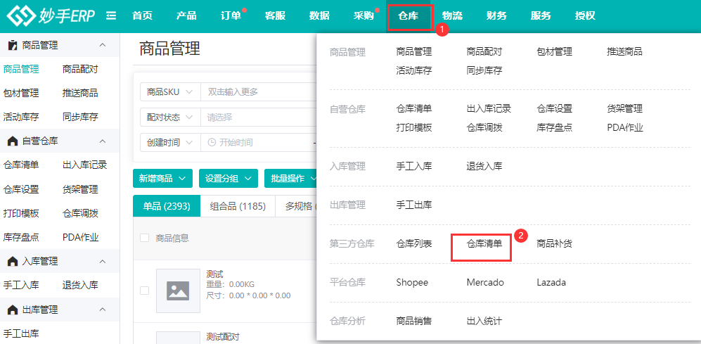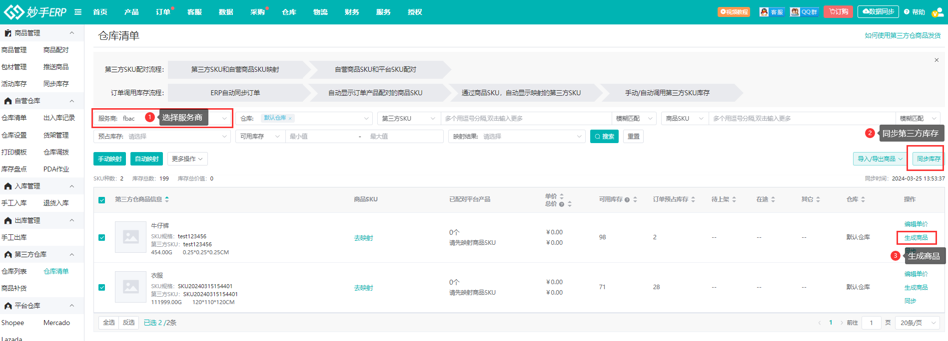 (1)进入妙手ERP,点击仓库-第三方仓库-仓库清单