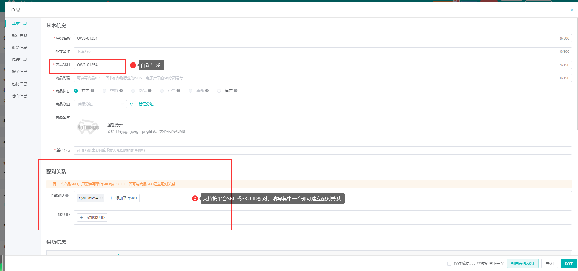 (3)点击生成商品,会跳转到商品管理的新增单品界面,在界面中,系统会根据海外仓SKU,自动生成商品SKU(默认与第三方SKU一致);完善其他的商品信息,比如商品名称、单价等,标*的为必填项。