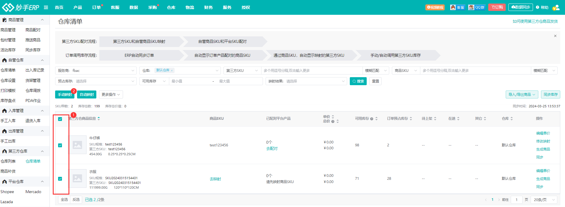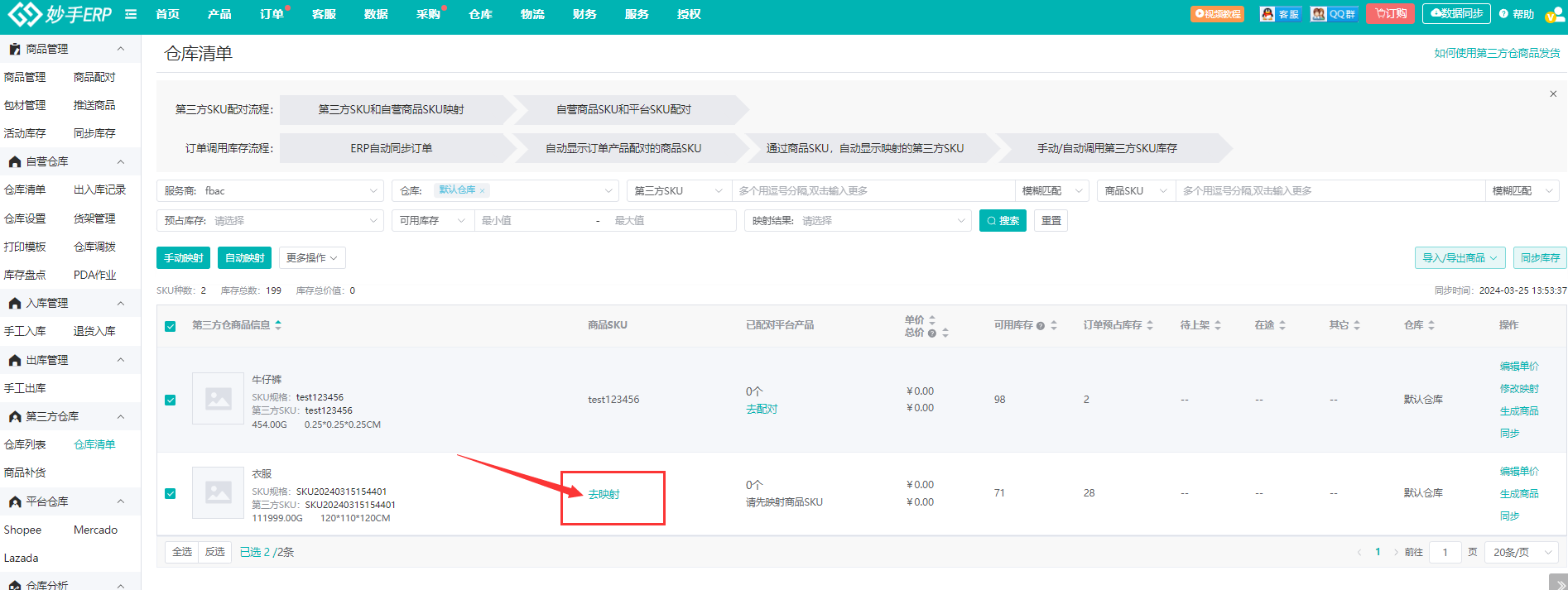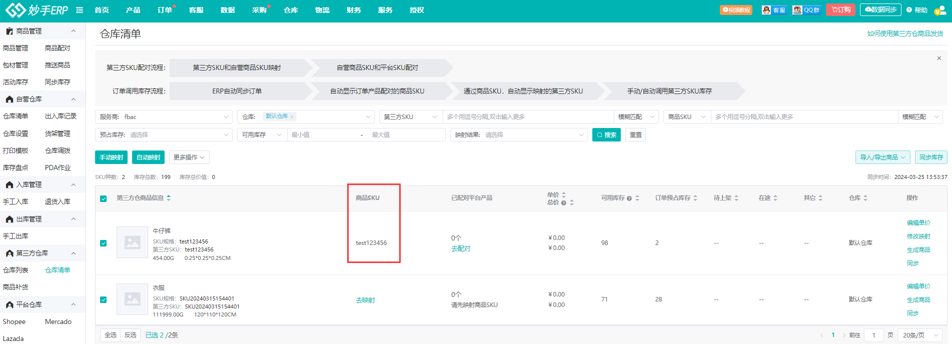 回到仓库清单,商品SKU与三方仓SKU会自动映射