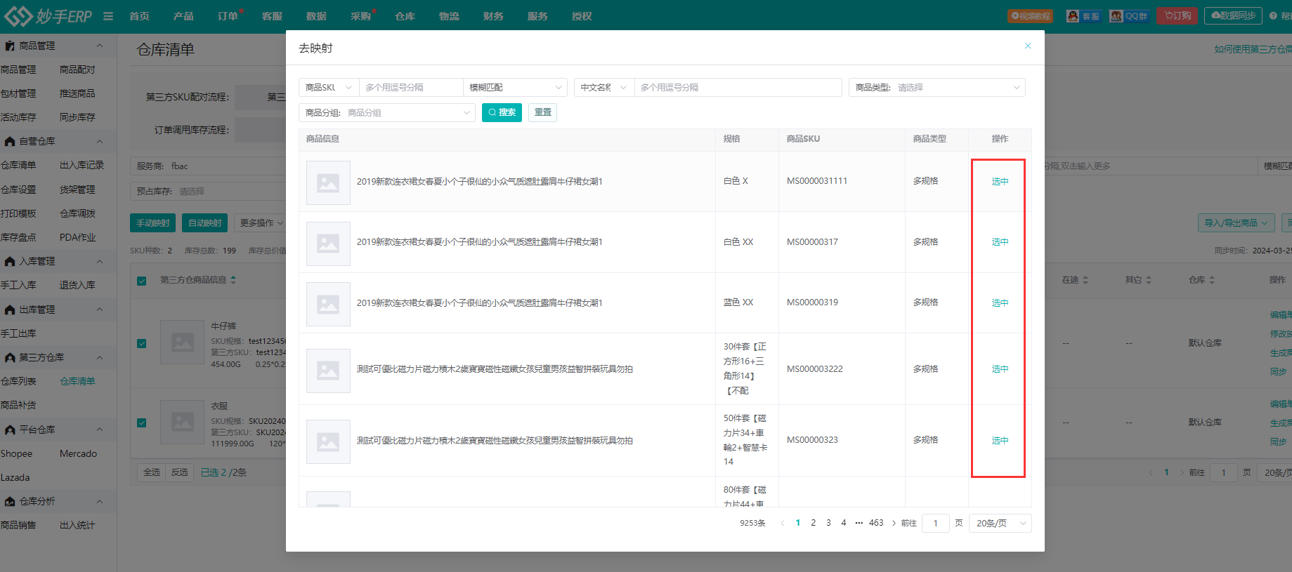 (1)在第三方仓库清单页面点击【去映射】,在弹窗中,会显示商品管理已有的商品,找到需要关联的仓库商品后点击【选中】即可。