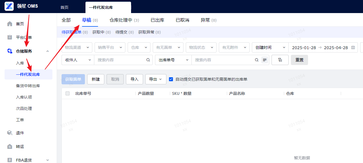 (4)此时单据推送到领星OMS-仓储服务-一件代发出库-草稿状态
