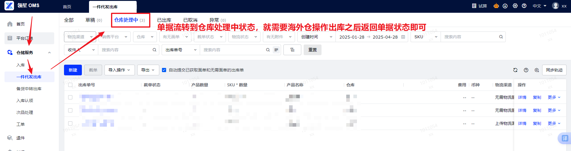 (5)使用海外仓打单渠道/平台物流的,会自动流转到一件代发出库-草稿-获取中/待提交的状态,获取到面单之后自动提交到仓库处理中(外部推送订单是定时任务自动提交,无法手动设置是否自动提交)