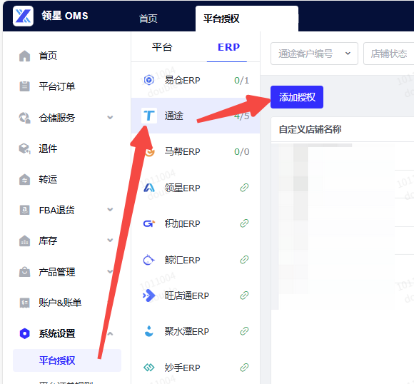 路径:领星OMS - 系统设置 - 平台授权 - ERP - 通途 - 添加授权